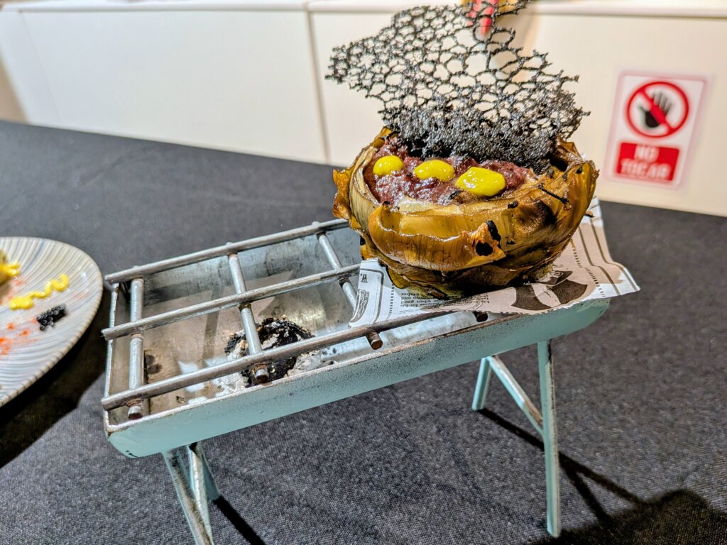El San Rafael conquistó al jurado con “Foc i Brasa”, una alcachofa elaborada al aceite de brasa de kamado, acompañada de cremoso de baldana caramelizada, emulsión de aceite de alcachofa y crujiente de carbón.