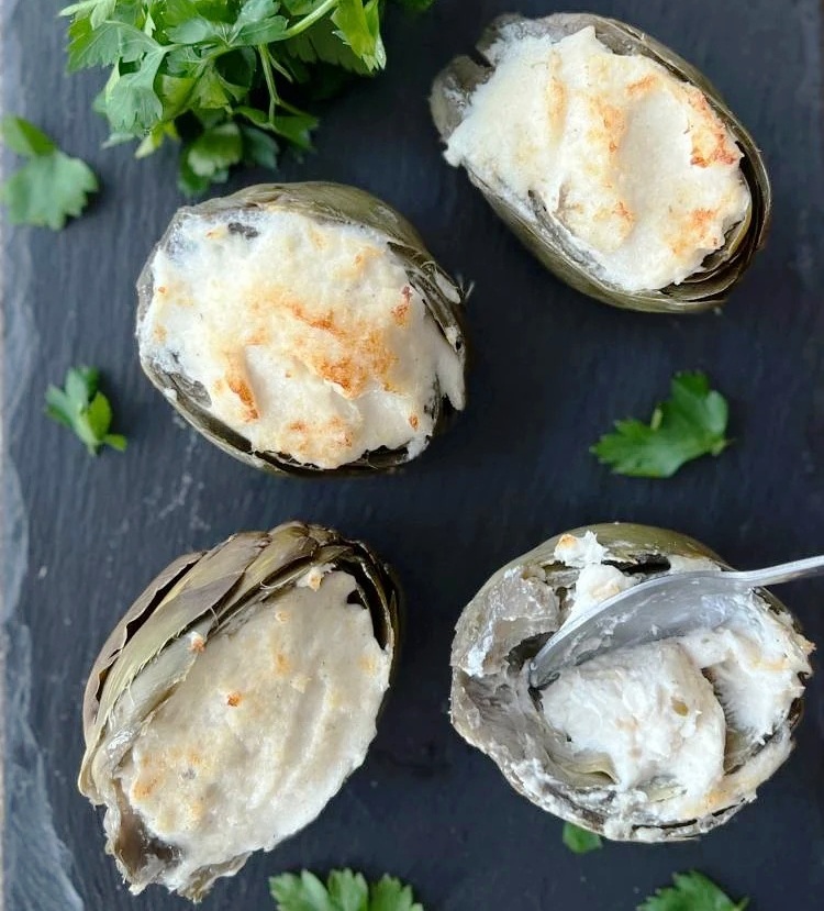 Corazones de alcachofa con jamón, queso y salsa romesco