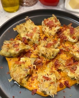 Receta para preparar unas flores de alcachofa con chorizo y queso rallado